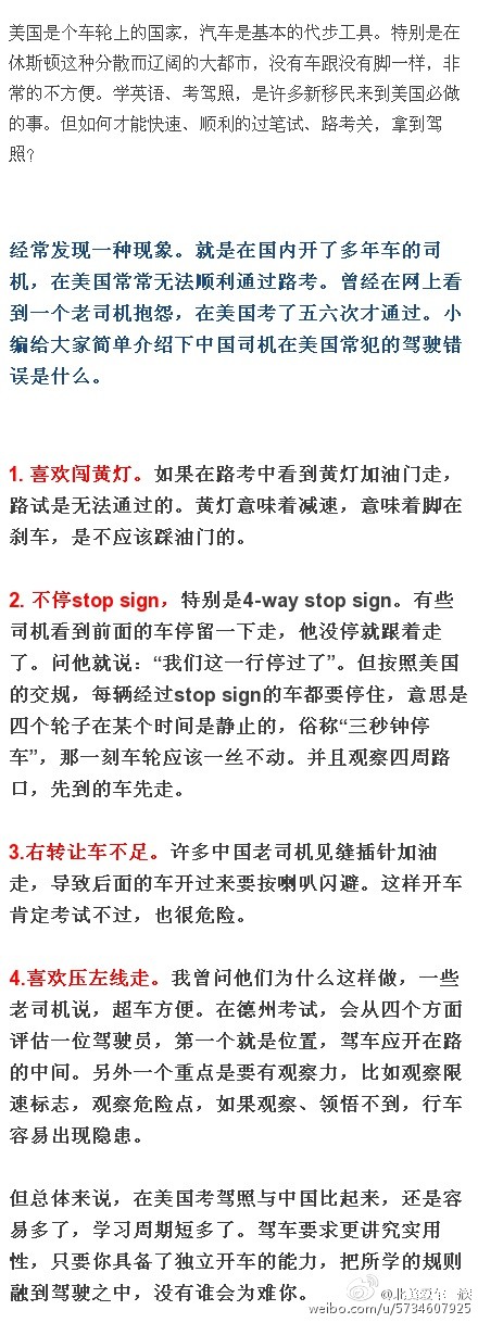 美國是個車輪上的國家。但是,經常發現一種現象。就是在國內開了多年車的司機,在美國常常無法順利通過路考。曾經在網上看到一個老司機抱怨,在美國考了五六次才通過。小編給大家簡單介紹下中國司機在美國常犯的駕駛錯誤是什么。