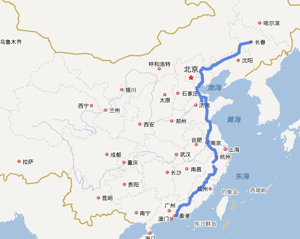 途經城市:長春-四平-阜新-朝陽-承德-唐山-天津-滄州-濱州-濰坊-臨沂-連云港-淮安-滁州-南京-常州-無錫-湖州-杭州-金華-麗水-南平-三明-龍巖-梅州-河源-惠州-深圳