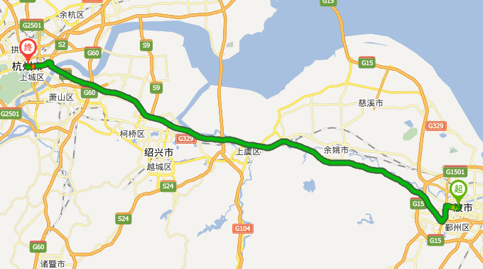 方案三:318省道 > G92杭州灣環(huán)線高速 > S2杭甬高速,用時(shí)3小時(shí)1分鐘,共153.7公里。(最短)