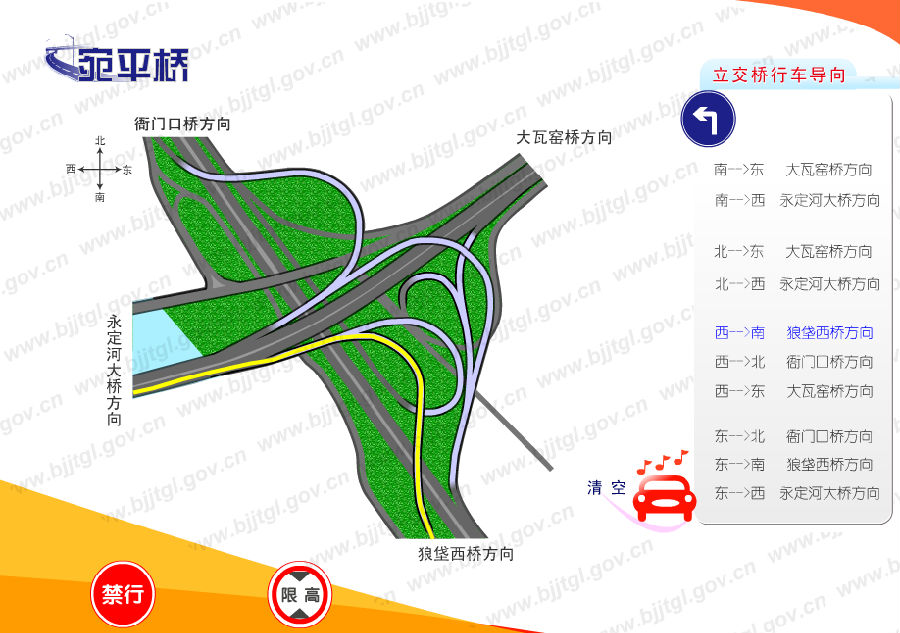 目前北京宛平立交橋走向相對復雜,分別為:往東 復興門橋方向;往西 五棵松橋方向;往北 航天橋方向;往南 蓮花橋橋方向。