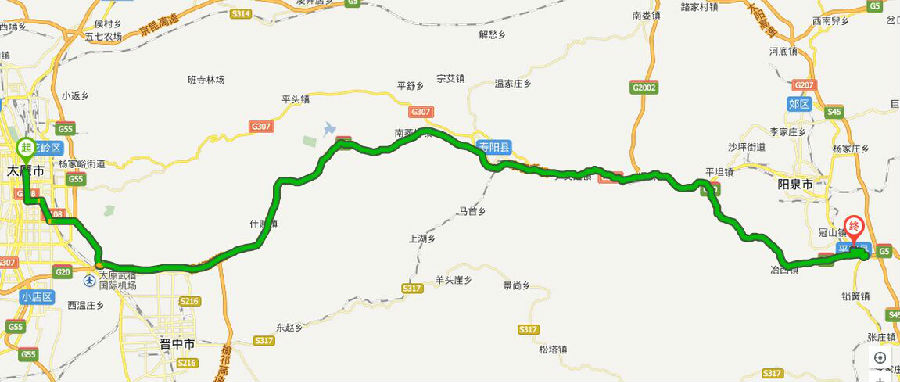 從太原開車到平定的總行程里數(shù)為128.4公里,開車時間需要2小時5分鐘