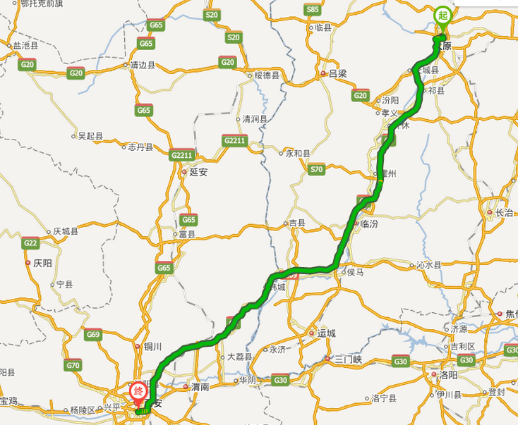 太原到西安路線地圖展示