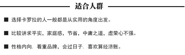 用戶方面,開卡羅拉的人群各行各業(yè)的都有,包括技術人員,公司白領,教師,以及生意人,一個共同的特征是以精明的心態(tài)追求有品質的生活。