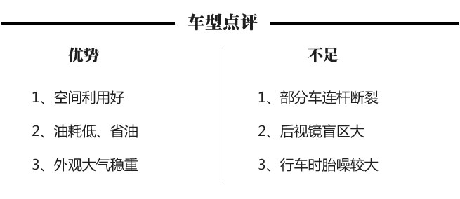 口碑方面,大空間低油耗是最大的賣點,新款外觀更時尚大氣,不過有少數車主反饋遇到連桿斷鏈,以及開車時噪音不小等問題。