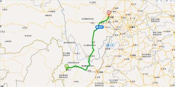 方案二:滬瑞線公路、平坡橋公路、大西線公路、S220公路、S308公路、S310公路、S214公路、京昆線公路、濱河路三段公路、滬聶線公路、新邛公路公路、大件路南段公路,用時1天8小時16分鐘,共1255公里。(不走高速,不用過路費)