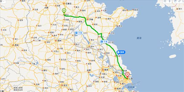 方案一:邢臨高速公路、高邢高速公路、青銀高速公路、京臺高速公路、濟南繞城高速公路、泰新高速公路、京滬高速公路、沿江高速公路、沈海高速公路、滬嘉高速公路,用時12小時0分鐘,共1071公里。(最快)