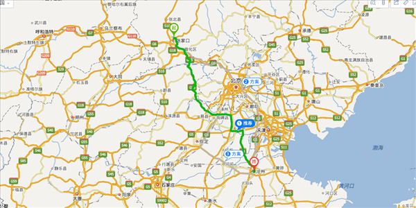方案一:張承高速公路、京藏高速公路、北五環路公路、東五環路公路、京津高速公路、京滬高速公路、浮陽北大道公路,用時5小時30分鐘,共414公里。(最快)