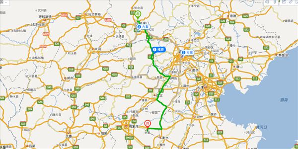方案二:張承高速公路、京藏高速公路、京新高速公路、首都環線高速公路、廊涿高速公路、京港澳高速公路、保滄高速公路、大廣高速公路、黃石高速公路,用時5小時29分鐘,共482公里。(時間最快)