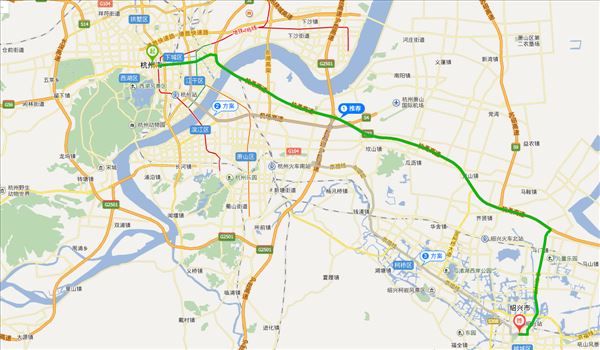 杭甬高速、杭州灣環線高速,用時1小時4分鐘,共63公里。