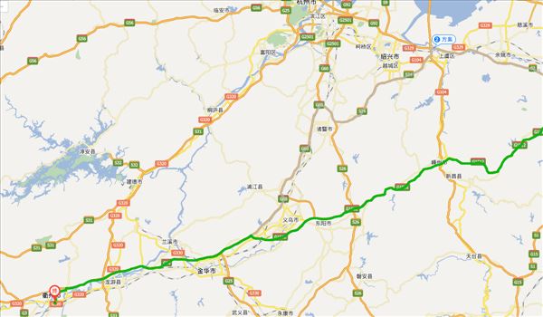 三四省道、三六省道、甬金高速、滬昆高速、S315、東跡大道,用時4小時40分鐘,共310公里。