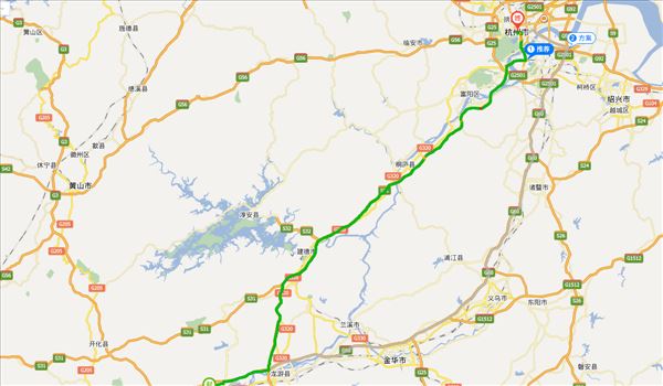 滬昆高速、杭新景高速、長深高速,用時2小時56分鐘,共220公里。
