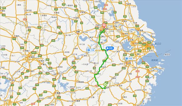 滬昆高速、京臺高速、、S322、X063、水西路、秋浦大道、蕪南路、滬渝高速、寧蕪高速,用時6小時46分鐘,共447公里。