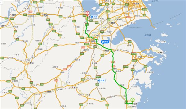 黃椒路、沈海高速、常臺高速、杭州灣環線高速、滬昆高速、杭州繞城高速、長深高速,用時4小時28分鐘,共354公里。
