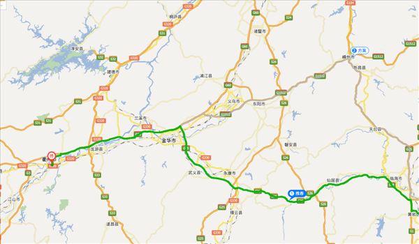 黃椒路、臺金高速、長深高速、滬昆高速,用時3小時37分鐘,共307公里。