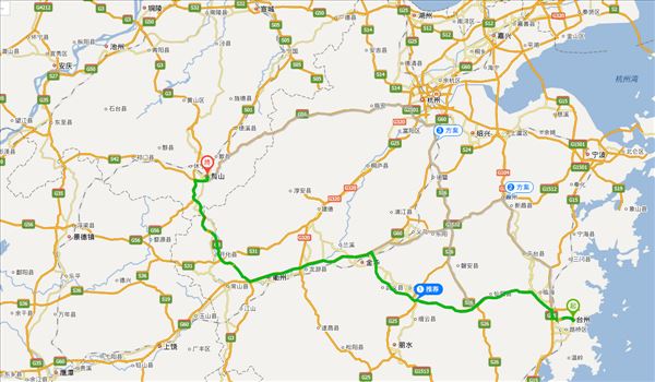 黃椒路、臺(tái)金高速、長(zhǎng)深高速、滬昆高速、京臺(tái)高速、杭瑞高速,用時(shí)5小時(shí)11分鐘,共446公里。