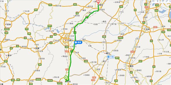 京深線、京港澳高速、G107、慶都西路,用時(shí)3小時(shí)56分鐘,共246公里。