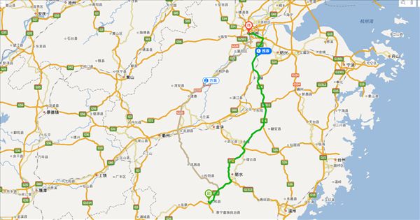 方案二:長深高速公路、東永高速公路、諸永高速公路、滬昆高速公路、杭州繞城高速公路,用時3小時51分鐘,共315公里。(時間最快)