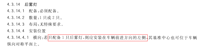 GB4785-2007《汽車及掛車外部照明和光信號(hào)裝置的安裝規(guī)定》4.3.14規(guī)定:只有一個(gè)后霧燈時(shí),后霧燈需裝在左側(cè)。