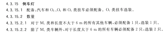 GB4785-2007《汽車及掛車外部照明和光信號(hào)裝置的安裝規(guī)定》4.3.15規(guī)定:長(zhǎng)度小于6米的汽車強(qiáng)制安裝1個(gè)倒車燈,可再選裝1個(gè)。長(zhǎng)度大于6米的汽車強(qiáng)制安裝2個(gè)倒車燈,可再選裝2個(gè)。