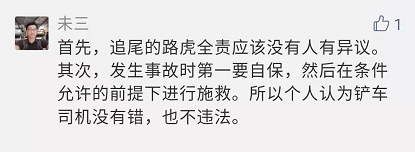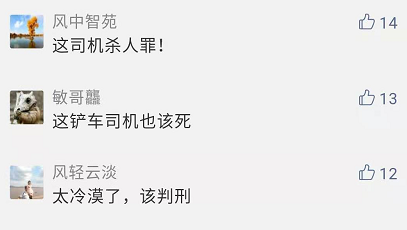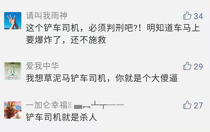也有一些人認為,鏟車司機沒有錯,發生事故時第一要自保,其做法不違法。