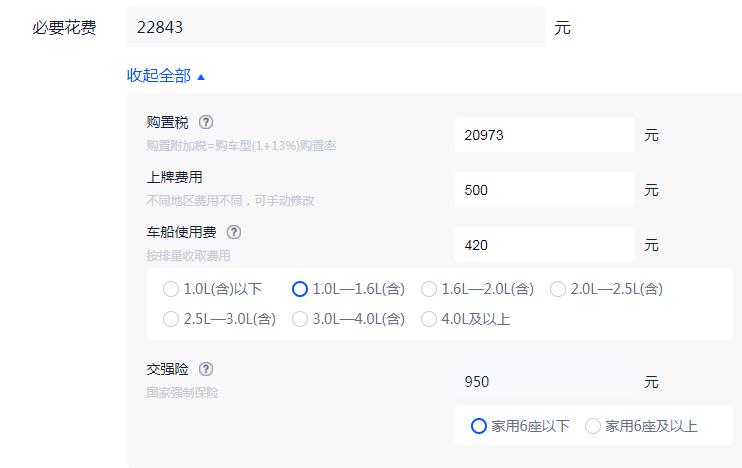 除了裸車費用,還需繳納購置稅、上牌費、車船使用費和交強險,具體費用如下: